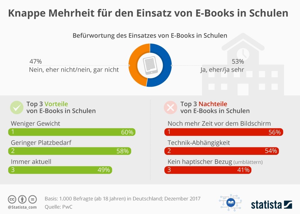 PwC hat in einer Studie festgestellt, dass die Mehrheit in Deutschland für den Einsatz von eBooks in Schulen sei. Die Befragung wurde Online erhoben und es gibt keine weiteren Angaben zur Auswahl, dem Kontext der Befragung bzw. dem Interesse, das die Befragten zum Ausfüllen geleitet hat (um den Hawthorne-Effekt wenigsten einschätzen zu können). Es ist davon auszugehen, dass eine Offline-Befragung noch andere Ergebnisse gezeigt hätte. Wie wir aus zahlreichen anderen Studien wissen, ist den meisten Befragten nicht ganz klar, was unter eBooks gemeint ist. Auch hier scheint die Bandbreite von den üblichen eBooks (EPUB 2.0 oder PDF) zum Lesen von Text über enhanced eBooks bis hin zu interaktiven Plattformen im Blick zu sein, betrachtet man unten die erwähnten Vor- und Nachteile von eBooks. Das entspräche dann nicht mehr dem heute in der Verlagsbranche üblichen Gebrauch des Begriffs. (Quelle: PwC)