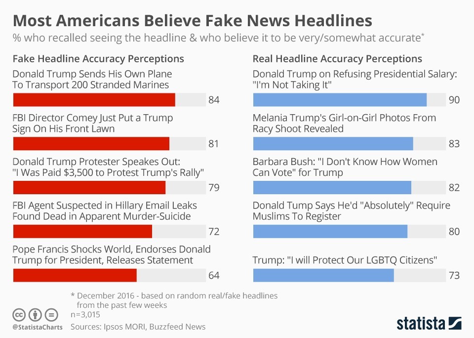 In einer Umfrage von statista können die meisten US-Amerikaner Fake News in den Überschriften nicht von geprüften Nachrichten unterscheiden. Ob eine Nachricht falsch oder richtig ist, hängt von der Einstellung des Lesers ab. (Quelle/Copyright: statista.com)