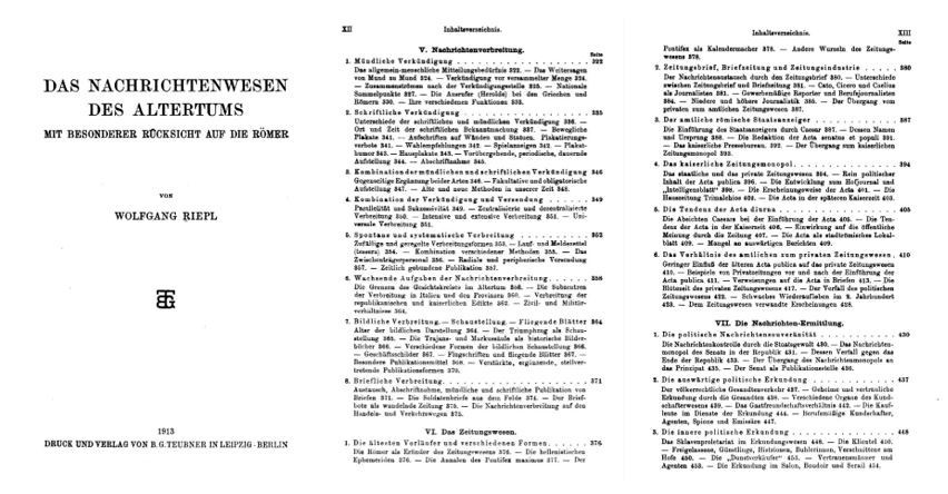 Das "Rieplsche Gesetz" geisterte vor allem nach der Einführung der Smartphones und Tablets durch die Präsentationen vieler Kongresse. Wolfgang Riepl hatte im Jahr 1915 (!) seine Dissertation mit dem herrlichen Titel "Das Nachrichtenwesen des Altertums. Mit besonderer Rücksicht auf die Römer" mit einem "Grundgesetz" versehen. Das wird gerne als Beleg dafür gesehen, dass die bestehenden Medien nach wie vor gebraucht werden. Das ist schon für die im Buch zitierten "berittenen Eilboten mit Relais" nicht mehr gültig und bei "Erkundungen im Salon, Boudoir und Serail" sicher heute etwas anders zu verstehen.