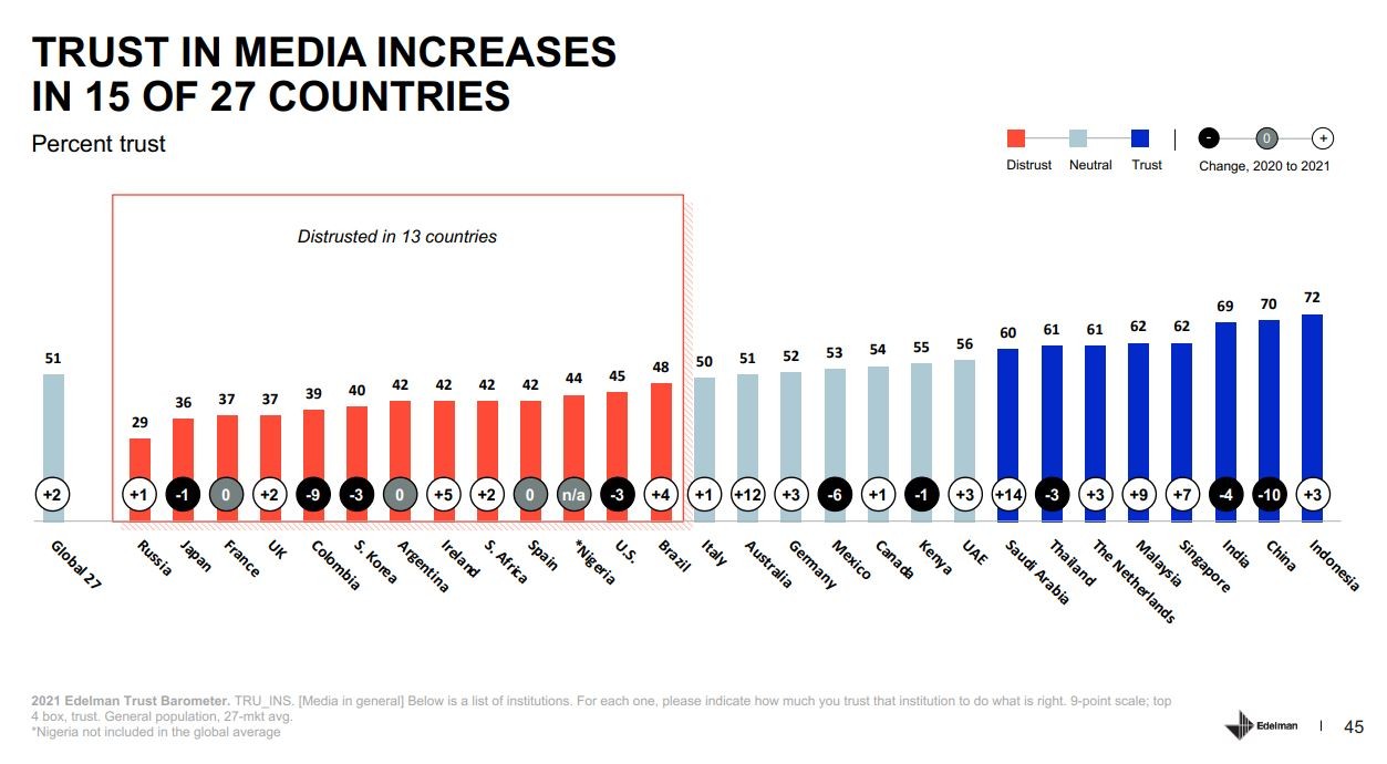 Den Medien wird für das Jahr 2020 kein gutes Zeugnis ausgestellt: Es sei dem sogenannten “Qualitätsjournalismus” nicht gelungen, für Vertrauen in die eigene Tätigkeit zu werben. Im Gegenteil, mehr befragte Menschen als je zuvor hatten den Eindruck, dass sie nicht richtig informiert werden. Insgesamt gesehen haben Journalisten 5 Prozentpunkte weniger Glaubwürdigkeit zugesprochen bekommen als im Jahr davor. Der Auslöser ist natürlich Corona und die damit zusammenhängende Frage, was man glauben kann, was Fake News und Verschwörungstheorien sind und was überprüfbare Fakten (siehe hier der Artikel dazu auf media). Dieser globale Blick berücksichtigt nicht die recht unterschiedlichen Entwicklung in den einzelnen Ländern. Nicht überall verlieren die Medien und Journalisten an Vertrauen und vor allem bei den gebildeten Schichten verzeichnen sie einen Zuwachs. Deshalb ist ein zweites Chart interessant, das Medienkompetenz als wichtige Fähigkeit für die Einschätzung der Welt in den Vordergrund rückt. Die wachsende Bedeutung der Medien als Quelle der Information zur Orientierung in der Welt wird damit erkannt. Und dass bestimmte Medienformate viel Zuspruch erfahren haben, dürfte mit diesem Bedürfnis zu tun haben, denken wir nur an die steigenden Abonnenten der Podcasts von Drosten oder der SZ oder die Zuwächse bei Abos von Anbietern vertiefender Recherchen wie der NYT oder der Zeit.