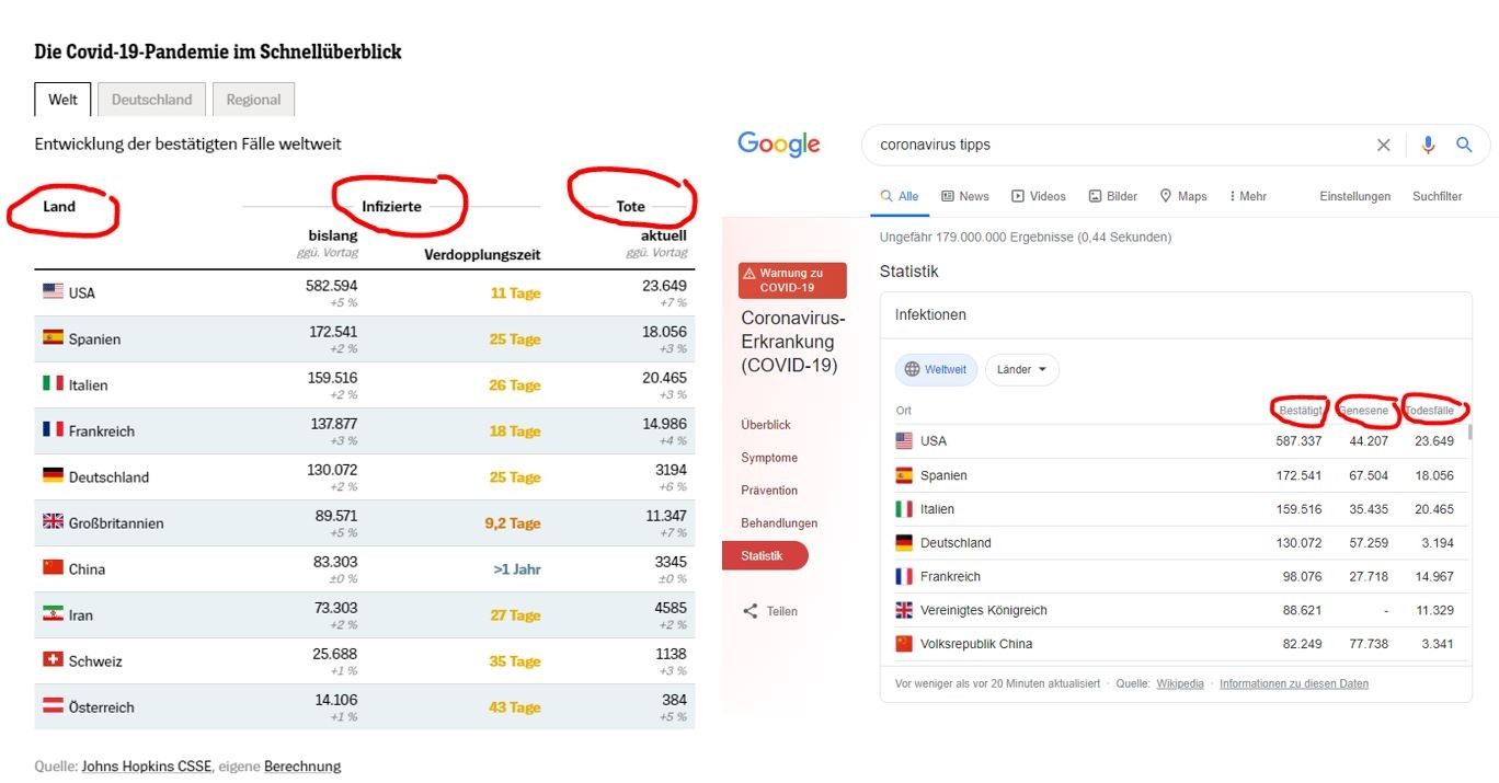 „The medium is the message“: Kein Medium ist objektiv und kann immer nur einen je eigenen Standpunkt zum Ausdruck bringen. Ein Abruf von zwei Statistiken zu Corona vom 14.4.2020 bei spiegel.de sowie Google zeigt beispielhaft, dass Zahlen und Daten einen scheinbar objektiven Vergleich bieten wollen – und zugleich eine nationale Konnotation hat, die beiden Unternehmen nicht nur gefallen dürfte. Denn der Ländervergleich prägt den Blick, ähnlich einem Medaillenspiegel bei Olympischen Spielen, wobei hier nicht einmal erläutert wird, warum gerade diese Länder gewählt wurden (warum nicht die direkten Nachbarn?). Die Flaggen verstärken durch ihren optischen Reiz die Botschaft, dass man es hier mit ganz klar getrennten Einheiten und Mengen zu tun hat. Die Nationen stehen im Vordergrund. Schon allein das mutet in Zeiten globaler Handelsbeziehungen, enger privater Kontakte über Ländergrenzen hinweg und ausführlicher Reisetätigkeiten seltsam an, zumal sich Viren ja gerade nicht daran orientieren, welche Staatsbürgerschaft ihr Wirt hat. Es wird nirgends erläutert, ob damit die in dem Land gerade befindlichen Personen oder die Staatsbürger, die auch gerade woanders leben könnten, gemeint sind. Wie man Infizierte mit welchen Methoden getestet hat kann man genauso wenig erkennen wie den Bezug von Todesfällen zu Infizierten. (Eine wissenschaftlich genauere Darlegung der Fehler dieser Betrachtung findet sich z.B. in dieser Analyse von Epidemologen u.a. Experten. Und auch der Spiegel hat nachgelegt mit einer ausführlichen Interpretation der Zahlen am 14.4.2020 mit dem Beitrag „Traue keiner Statistik,…?“) Das Problem dieser durch Zahlen scheinbar so sachlich nüchternen Tabelle ist, dass sie die Basis darstellt für verschiedenste Narrative, die sich in der Gesellschaft dann verfestigen und die sich an den Kategorien orientieren „Die USA sind am schlimmsten dran, weil sei am meisten Infizierte und Tote aufweisen.“ / „China hat die Krise erfolgreich überwunden, weil es kein Wachstum gibt bei Infizierten und Toten.“ / „In Deutschland sterben weniger Menschen an Corona als in anderen Ländern mit vergleichbar vielen Infizierten.“ / „Österreich hat die Krise überwunden.“ etc. Jetzt könnten sich einige dieser Aussagen wahrscheinlich auch in ein paar Wochen und bei genauerer Analyse bestätigen und sie wirken auf den ersten Blick plausibel. Das Problem liegt aber darin, dass nicht nur der Vergleich hinkt, weil die Zahlenbasis aus den verschiedenen Ländern statistisch gesehen viele Fehler aufweist. Zugleich suggerieren die Zahlen verlässliche Fakten und scheinen die Wirklichkeit abzubilden, sind aber bestenfalls Indikatoren. Diese Darstellungen beflügeln ein Narrativ, das geprägt ist von nationalstaatlichen Maßnahmen und Interessen. Das muss per se nicht schlecht sein, denn ein Staat hat ja die Aufgabe, seine Bürger zu schützen. Und es geht zum Zeitpunkt 14.4.2020 auch darum zu erkennen, ob die Maßnahmen des eigenen Staates richtig oder falsch sind. Man sollte aber nicht glauben, mit Darstellungen wie der oben würde man auch nur annähernd ein Narrativ unterstützen, das zu einer europäischen oder gar globalen Einheit aufrufen würde, denn die Botschaften der Bilder und Zahlen zeugen von einem ganz anderen Interesse. Man stelle sich nur eine Darstellung mit einer europäischen Flagge vor, Kategorien wie „Menschen ab 60 mit Vorerkrankungen“, „Bewohner von Altenheimen“, „Pflegekräfte“ etc. – und schon würden sich ganz andere Narrative darauf aufbauen lassen. Will man eine Pandemie bekämpfen, so sind ja gerade länderübergreifende Maßnahmen nötig. Die Darstellung zeigt einmal mehr, dass in Krisenzeiten Eigeninteressen Vorrang haben und die Zugehörigkeit zu einer „Nation“ scheinbar stärker wirkt als zu einer internationalen Personengruppe wie Ärzte, Herzpatienten etc., wahrscheinlich weil sie einfacher zu verstehen ist und man der Exekutive des eigenen Staates unterworfen ist.