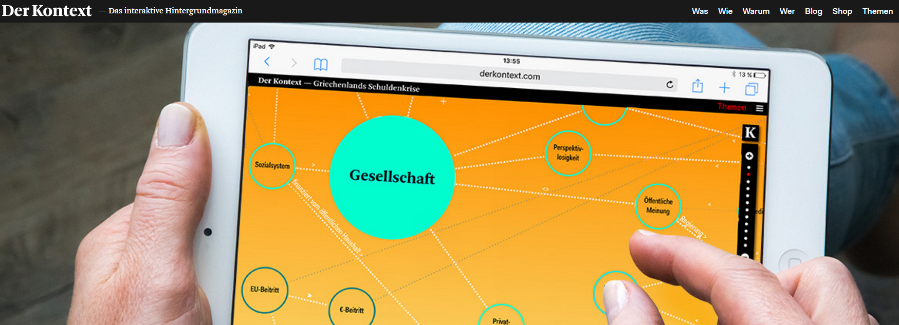 Die Themen werden wie in einem Spinnennetz aufgefächert und können dann vertieft betrachtet werden. Der Nutzer kann den vorgeschlagenen Assoziationen folgen und immer wieder zwischen Vogelperspektive und vertiefenden Inhalten wechseln.