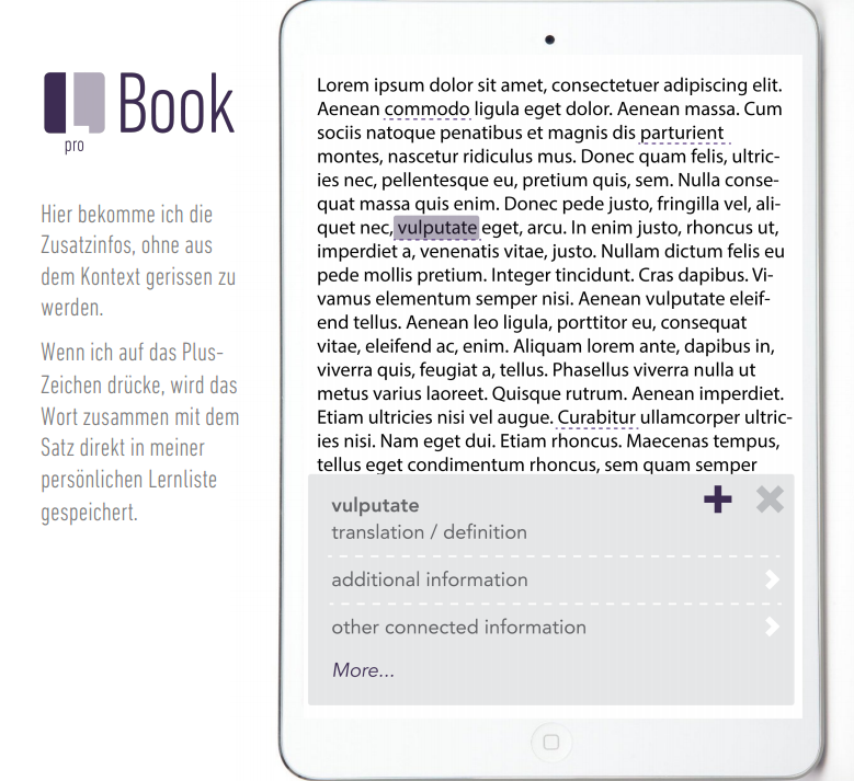 Einen anderen Weg geht L-Book, einer Lernplattform, die sich die Vorteile der eReader angesehen hat. Dort kann der Leser ja im Vergleich zum gedruckten Buch Wörter oder Textstellen markieren, nachschlagen, lernen. Nach diesem Prinzip lassen sich unterschiedliche Formate zum Text ergänzen und der Lesetext wird ergänzt. Ist das Prinzip einfach und klar, so können die Anwendungsfälle sehr breit gestreut sein. Vom Sprachlernen bis zur Erläuterung schwieriger Begriffe in einem literarischen Text reichen die Beispiele, von Bildern bis zu Audiofiles die Formate.