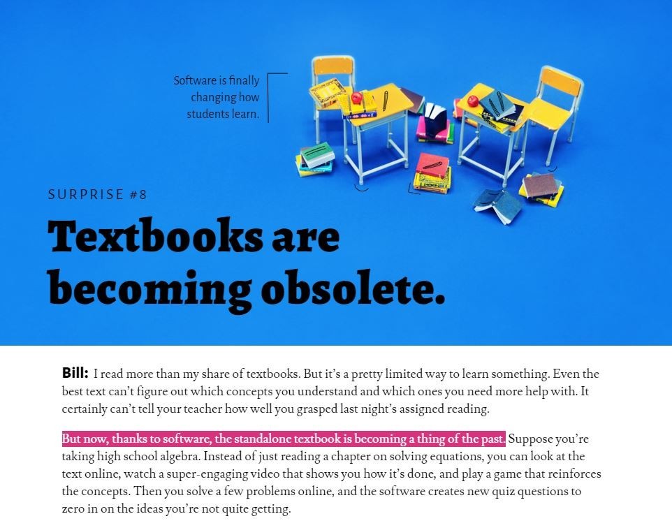 Im diesjährigen “annual letter” von Melinda und Bill Gates findet sich unter “surprise 8” die Aussage, “textbooks are becoming obsolete”. Wer sagt´s denn! Grund genug, unsere Annahmen zum Lehrwerk der Zukunft von 2012, 2013, 2014, 2015, 2016, 2017 oder 2018 nochmal zu überprüfen. Denn waren auch für uns vor ein paar Jahren die Neuerungen noch wirkliche Entdeckungen, so drängt sich jetzt der Eindruck auf, es gäbe doch nichts Neues unter der Sonne. Gerade in der aktuellen Diskussion um den Digitalpakt werfen so viele mit altbekannten Textbausteinen um sich und man fragt sich, ob in den letzten zehn Jahren wirklich etwas passiert wäre. Denn einerseits könnten wir jeden Verweis auf Neuerungen im Markt mittlerweile kinderleicht als Kopie darstellen, so viel ist im letzten Jahrzehnt passiert. Andererseits hat man den Eindruck, Bildung ziehe im Schneckentempo durch die Institutionen und nichts passiere. Beides ist falsch, hier die Thesen: