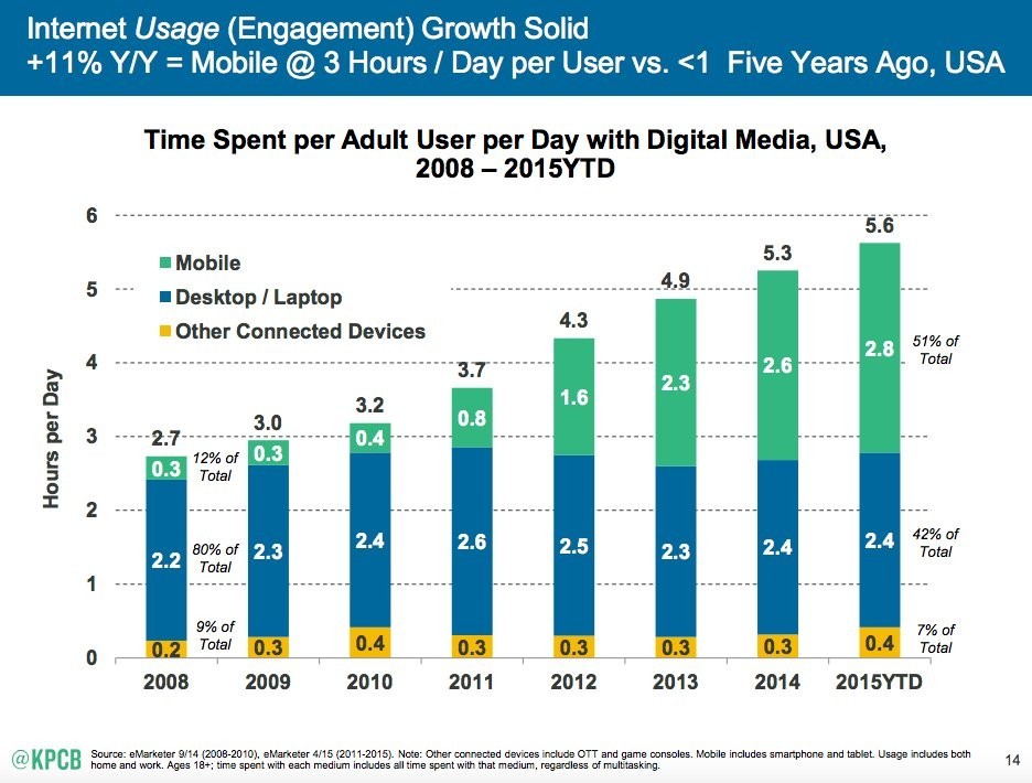 Die Nutzungszeit von Digitalmedien nach Kanälen in den USA (Quelle/Copyright: KPCB Internet Trends Report 2016, https://de.slideshare.net/kleinerperkins/2016-internet-trends-report)