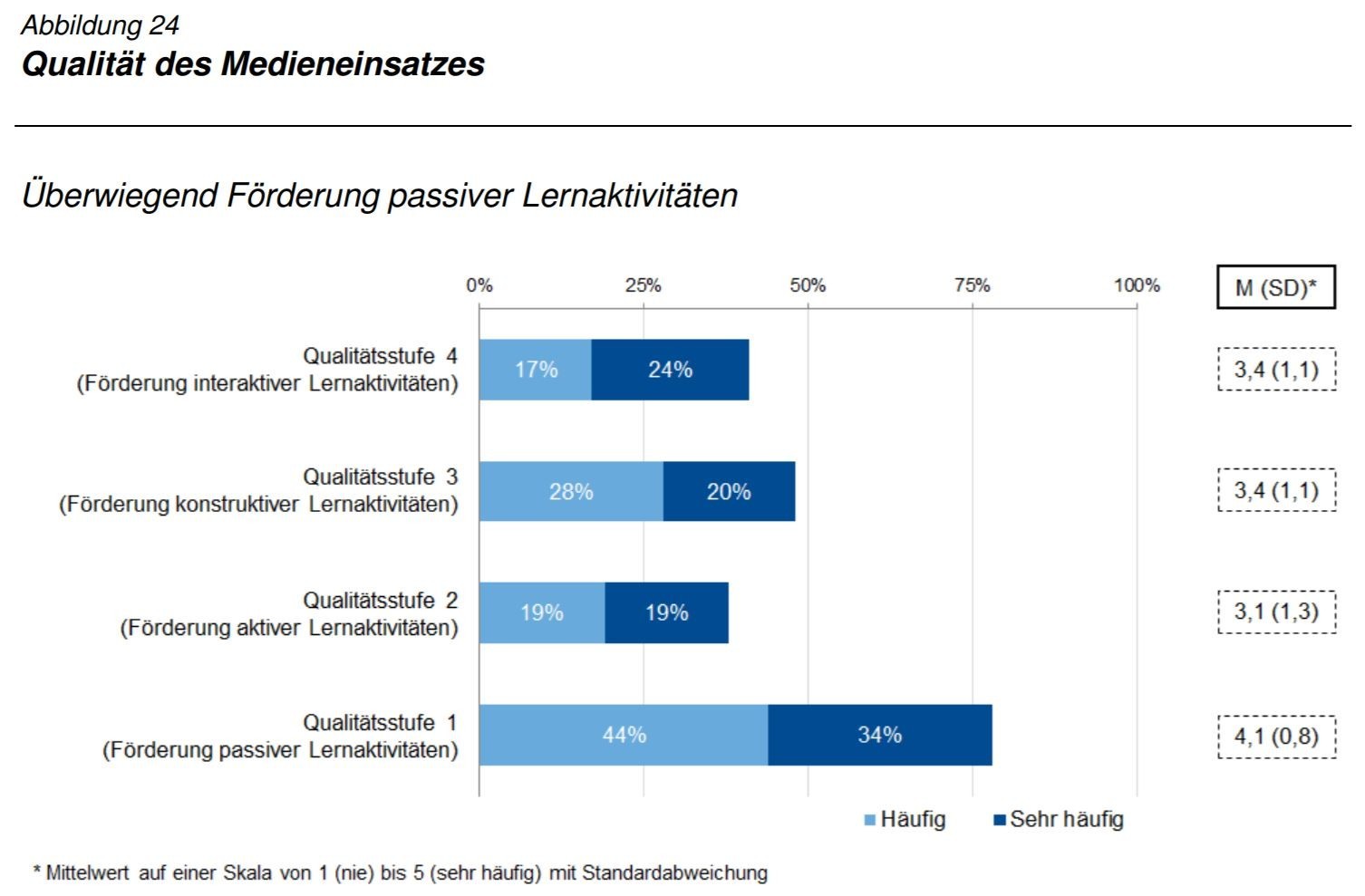 Das ist wichtig, denn bisher wird viel zu häufig nur auf die Quantität geachtet im Sinne von “welche Technologie wird wo genutzt?”. Das langsame Verfaulen der Smartboards ist hier aber der beste Beleg dafür, dass eine Technologie noch keinen Sommer macht, geschweige denn “gute digitale Bildung”.