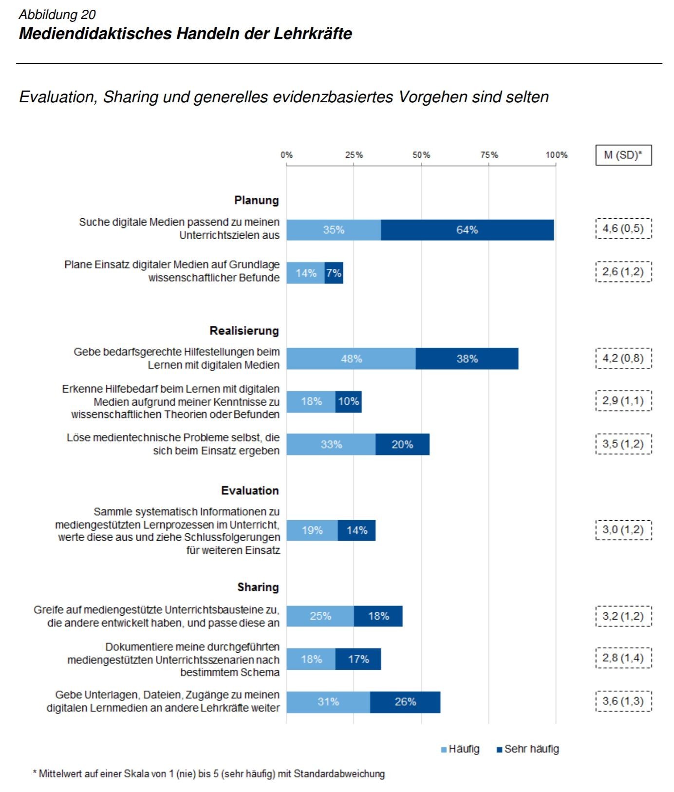 In der Studie der vbw wurden Lehrkräfte nach ihrer Medienkompetenz befragt. Und viele zeigten sich aufgeschlossen und interessiert, auch wenn sie ihre eigene Kompetenz höher einstufen als es ihr Gebrauch vermuten lässt. Deshalb hat die Studie klug auch das “mediendidaktische Handeln” als Kriterium für eine qualitativ “gute digitale Bildung” eingeführt. Hieran erkennt man, dass digitale Medien noch vorwiegend als “ein weiteres Angebot unter vielen” verstanden wird. Aber genau das leugnet die grundlegende Veränderung, die sich durch die Digitalisierung ergibt, und mindert die Qualität. Erst wenn digitale Medien aktiv von Schülern wie Lehrern genutzt, kommentiert und verändert werden, wird Medienkompetenz gelehrt. (Quelle: vbw)