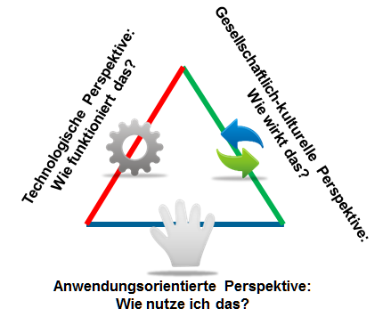 Das Dagstuhl-Dreieck und die drei wesentlichen Perspektiven der digitalen Bildung: Technologie, Anwendung und gesellschaftliche-kulturelle Wirkung müssen immer zusammen gedacht werden. (Quelle: http://wiki.doebe.li/Dagstuhl/WebHome)