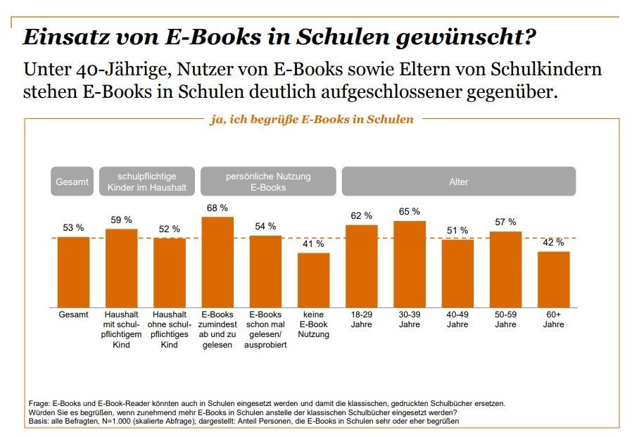 PwC hat in einer Studie festgestellt, dass die Mehrheit in Deutschland für den Einsatz von eBooks in Schulen sei. Die Befragung wurde Online erhoben und es gibt keine weiteren Angaben zur Auswahl, dem Kontext der Befragung bzw. dem Interesse, das die Befragten zum Ausfüllen geleitet hat (um den Hawthorne-Effekt wenigsten einschätzen zu können). Es ist davon auszugehen, dass eine Offline-Befragung noch andere Ergebnisse gezeigt hätte. Wie wir aus zahlreichen anderen Studien wissen, ist den meisten Befragten nicht ganz klar, was unter eBooks gemeint ist. Auch hier scheint die Bandbreite von den üblichen eBooks (EPUB 2.0 oder PDF) zum Lesen von Text über enhanced eBooks bis hin zu interaktiven Plattformen im Blick zu sein, betrachtet man unten die erwähnten Vor- und Nachteile von eBooks. Das entspräche dann nicht mehr dem heute in der Verlagsbranche üblichen Gebrauch des Begriffs. (Quelle: PwC)