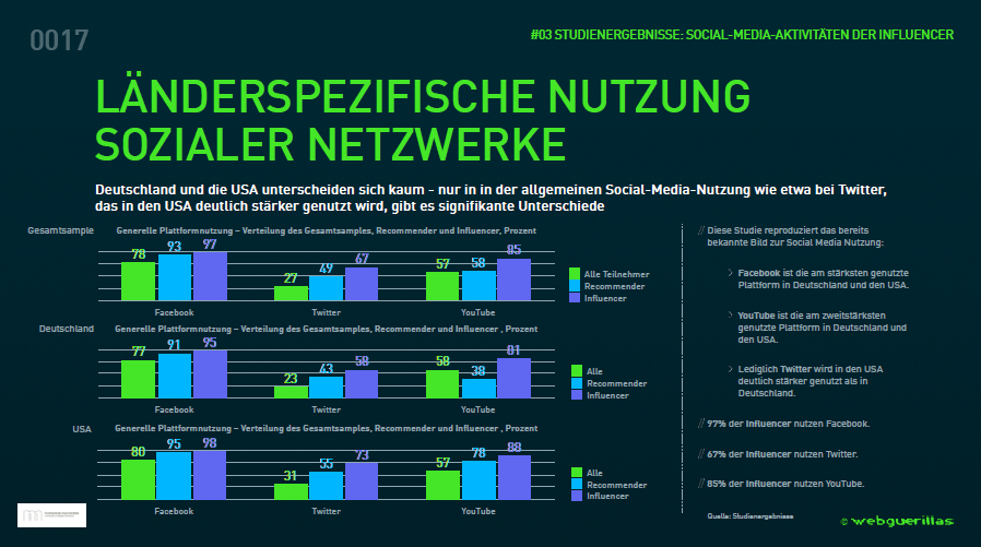Der Studie zu Folge unterscheiden sich das Verhalten in den USA und Deutschland kaum. Lediglich bei Twitter ergibt sich eine unterschiedliche Häufigkeit der Nutzung und damit Bedeutung. Facebook, YouTube und Twitter sind die wichtigsten Kanäle für die Influencer.