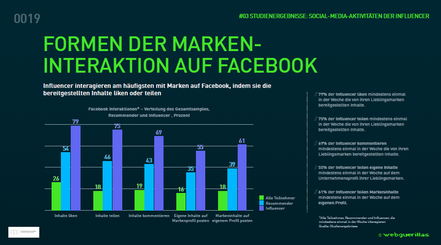 Influencer liken (79%), teilen (75%) und kommentieren (69%) die von ihren Lieblingsmarken vorgeschlagenen Inhalte überdurchschnittlich oft. (Quelle/Copyright: Macromedia/webguerillas)