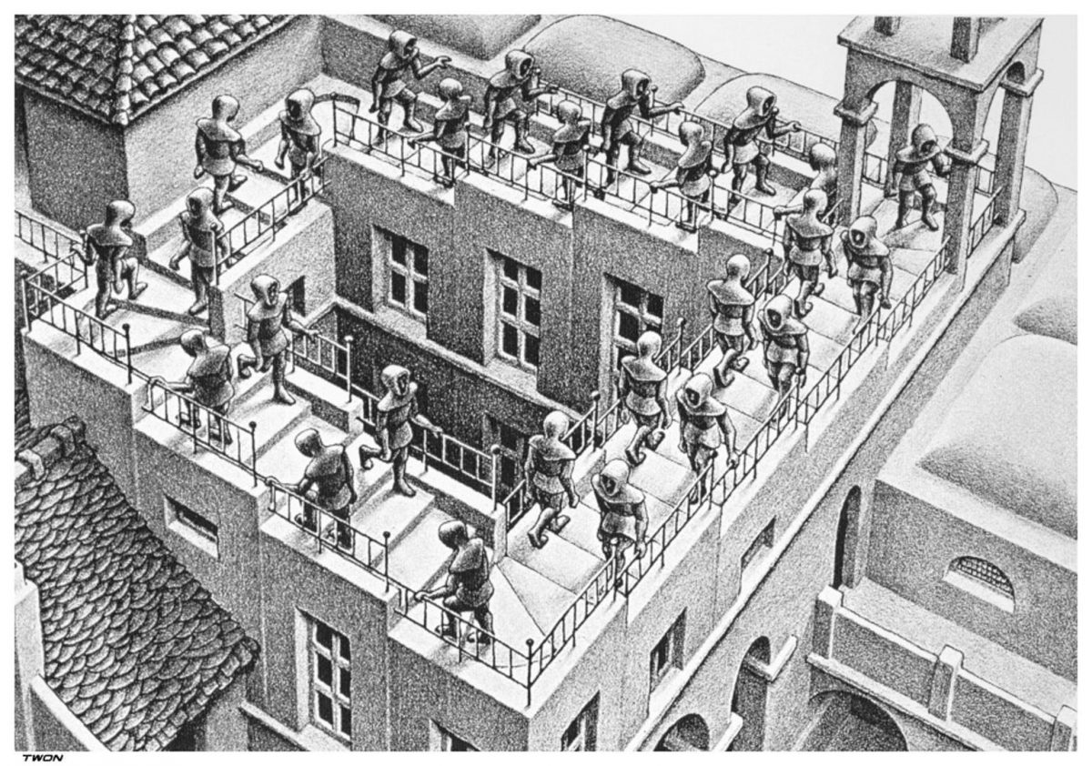 Relativieren wir den Begriff “künstliche Intelligenz”. Intelligenz ist mehr als ein IQ-Test und es macht Sinn zu sagen, “dumm” ist, wer nicht die Fähigkeit hat, eigenständig zu entscheiden. Denn ziehen wir den Stecker und füttern das Programm mit den entsprechenden Daten, so kommt das heraus, was wir als Kontext setzen: “garbage in – garbage out”, heißt es beim machine learning. Wer Mist reinsteckt, erhält auch nur Mist. KI ist ein selbstreferenzielles System, in dem man wie in einem Bild von Escher in der eigenen Schleife bleibt.