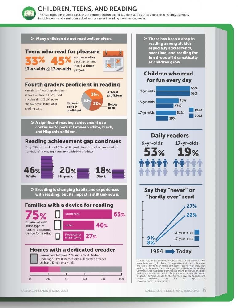 Eine Studie von Common Sense Media aus den USA hat herausgefunden, dass im Vergleich zu 1984 immer weniger Kinder aus Freude lesen. Das wird wohl weniger am Angebot liegen, sondern einfach daran, dass andere Freizeitaktivitäten wichtiger geworden sind. Besonders bei Jugendlichen versprüht das Buch kaum Charme. Klassisch bleibt auch dort der Unterschied zwischen den traditionell lesefauleren Jungen und Mädchen. Und die Prägung durch das Elternhaus wird vor allem deutlich, wenn man die Unterschiede zwischen Latinos, der weißen und farbigen Bevölkerung betrachtet: Wenn das Lesen zu Hause einen Wert hat, überträgt sich dieser auf die Kinder.