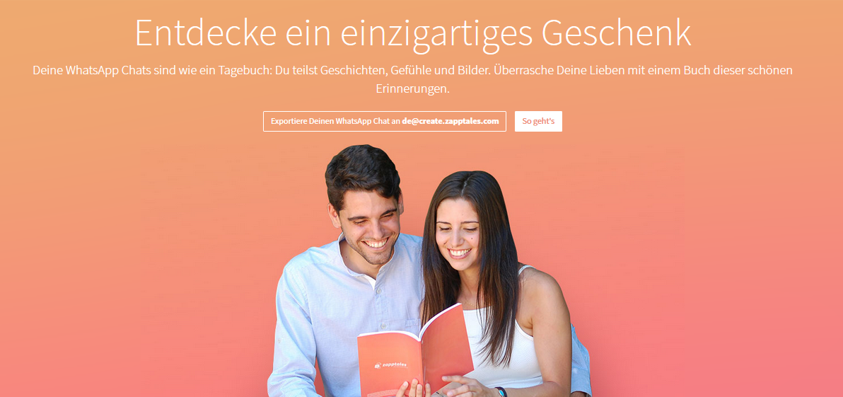 WhatsApp durchdringt mittlerweile alle Lebensbereiche und wird vom privaten Chat inzwischen zum veritablen Instrument für die Unternehmens-Kommunikation. Gleichzeitig häuft sich das Phänomen, dass die virtuelle Welt nach der realen Bestätigung zu suchen scheint: digitale Angebote werden durch Printangebote erweitert oder Onlineshops suchen die reale Verkaufsmöglichkeit im Laden. ZappTales geht als Start-up gleich diesen Weg. Der Kunde erhält hier die Möglichkeit, aus WhatsApp-Chats ein analoges oder digitales Buch zu erstellen, als individuelles und originelles Geschenk, als Backup oder als ganz persönliche Erinnerung.