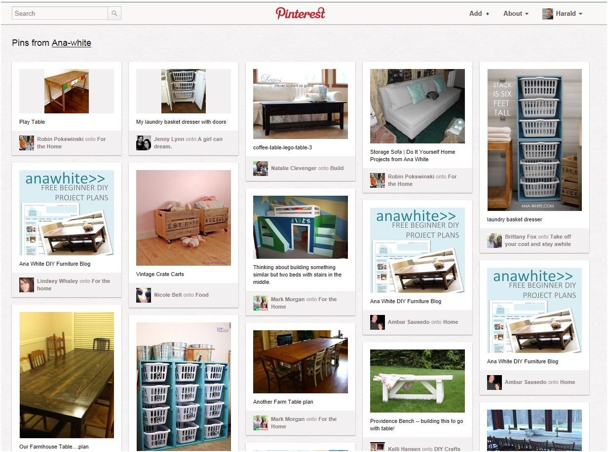 Hier ist die schon einmal erwähnte Website von Anna White (Archiv) ein gutes Beispiel, wie das Posten von eigenen Bildern auf Pinterest täglich fast 6.000 Besucher auf die eigenen Seiten lockt. Anna White bietet auf ihrer Website Anleitungen zum schönen Gestalten des Eigenheims. Anleitungen und die Bilder der Möbel werden auf Pinterest gepinnt. Es sind Originalbilder, die immer auf die Quelle verweisen und dadurch das eigene Angebot bekannter machen. Natürlich eignet sich das besonders gut bei einem Thema wie selbstgestaltete Möbel. Aber warum sollten Verlage und Buchhandlungen nicht auch eigene Werbekampagnen, Cover oder Aufnahmen von Autoren hier “pinnen”? Kataloge von Büchern ließen sich ebenfalls einbinden. Oder man kann nach dem Aufbau einer Fangemeinde Wettbewerbe zu den Covern von Büchern veranstalten.