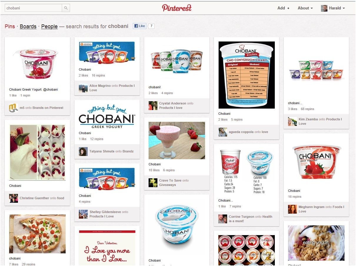 Wie immer im Netz gehört das Geben und Nehmen dazu. Nur die eigenen Bilder zu pinnen ist der erste Schritt. Um den Traffic zu erhöhen, sollten auch noch verwandte Bilder von anderen aufgenommen werden. Das ermöglicht die allmähliche Entwicklung von Themengebieten, weil sich mit der Zeit alle Interessierten hier versammeln. Chobani Joghurts stellt deshalb z.B. auch Bilder anderer auf seine Seite.