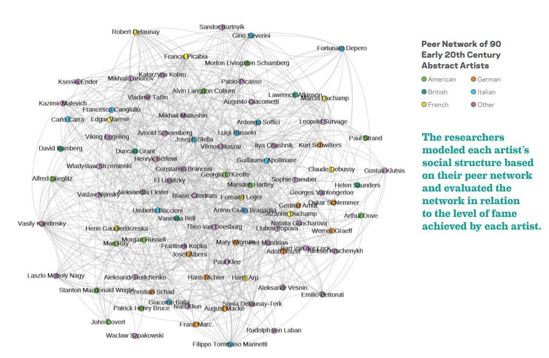 Die Studie der Columbia Business School hat abstrakte Künstler des 20. Jahrhunderts untersucht und keine Relation zwischen Kreativität und Ruhm feststellen können. Wichtiger für den Erfolg war vielmehr ein heterogenes Netzwerk, so dass die eigene Arbeit von vielen verschiedenen Stellen wahrgenommen werden konnte.