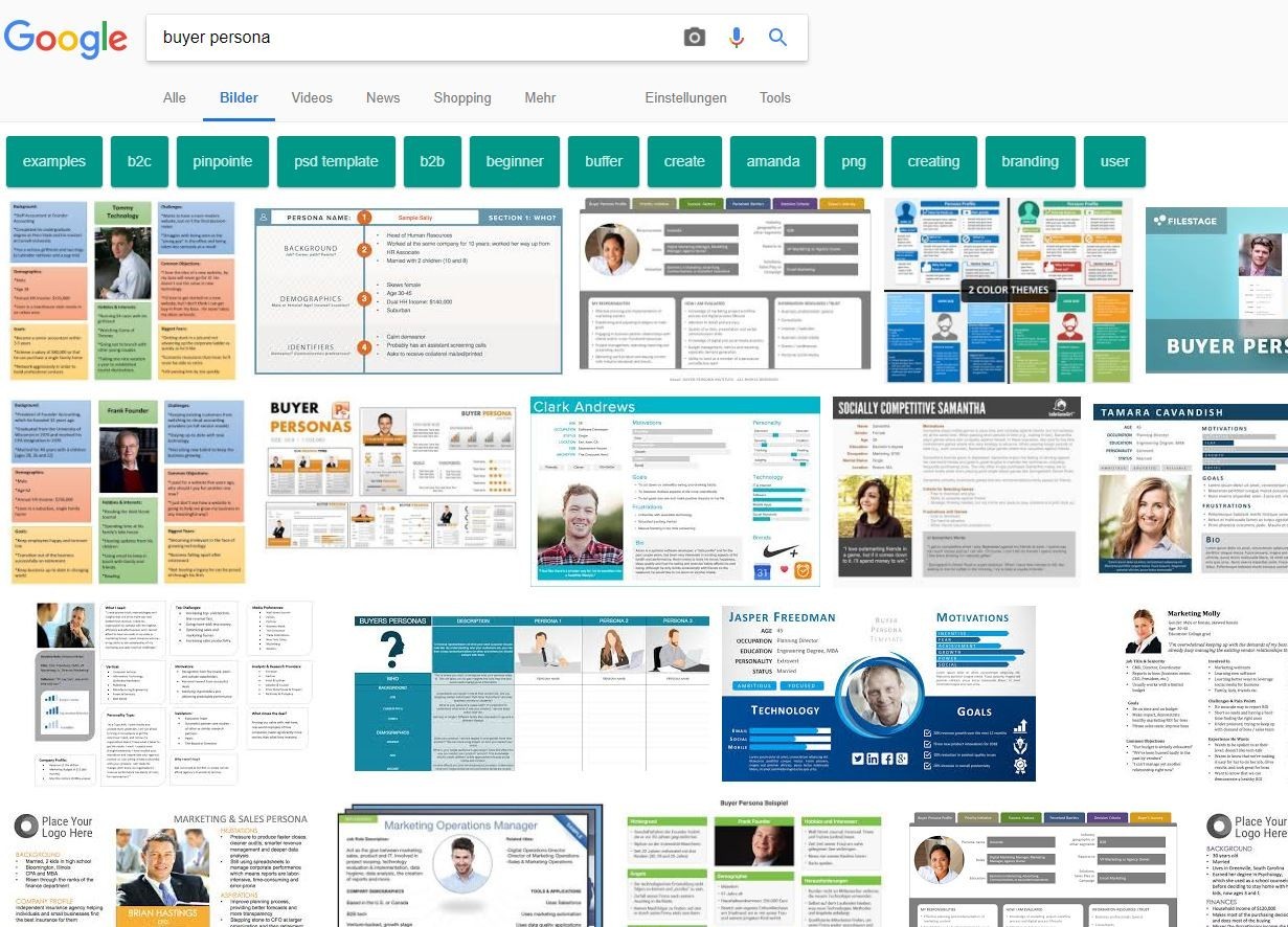 Der Steckbrief zu Buyer Personas ist sicherlich den meisten bekannt und in manchen Unternehmen hängen die Personas auch schön sichtbar an der Wand wie ein memento mori. Allein auf Google Bilder finden sich zahllose Muster für die Darstellung. Hier sollte jeder seine Fassung erstellen. Wichtig ist dabei, dass die Angaben, die auf dem Steckbrief zusammengefasst sind, auch zum Ziel und dem Einsatz der Personas passen.