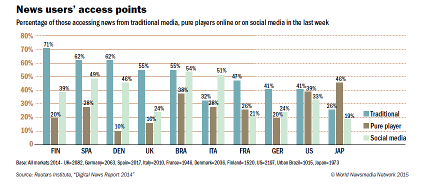 Soziale Netzwerke werden auch als erste Anlaufstelle für Nachrichten immer bedeutender. In den verschiedenen Ländern ist das Verhältnis von traditionellen Marken, rein digitalen Anbietern wie Google News und sozialen Netzwerken je anders. In Deutschland fällt auf, dass die Hälfte der Zugänge über die neuen Anbieter und soziale Netzwerke erfolgt. Dabei spielen für die einzelnen Magazine und Zeitschriften auch ganz unterschiedliche soziale Plattformen eine Rolle.