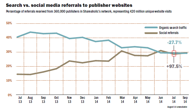 Als Folge davon erkennen Verlage, dass sie zunehmend Besucher aus den sozialen Netzwerken auf ihren Webseiten erhalten. Vor gut einem Jahr sind erstmals mehr Personen über soziale Netzwerke auf die Seiten von Verlagen gelangt als über die reine Suche. Dies ist auf verschiedene Effekte zurückzuführen: