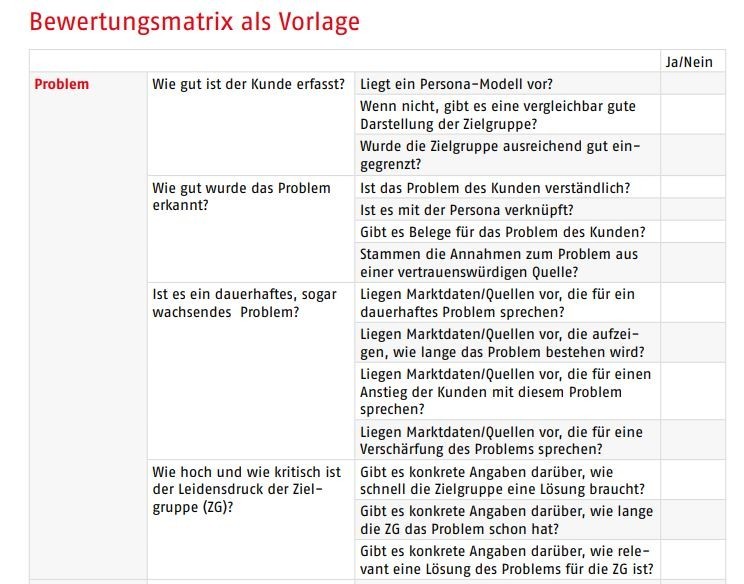 In unserer Bewertungsmatrix starten wir wie üblich mit der Frage nach dem Problem, das es zu lösen gilt. Hier offenbart sich als erstes, ob man wirklich an den Kunden denkt oder doch eher von der Lösung her. Und natürlich darf man hier den bisherigen Befragungen der Kunden und Freunde nicht trauen und muss bis hin zur Entwicklung eines mvp genau prüfen, ob das Start-up ernsthaft an der Entwicklung der Lösung interessiert ist. Ein Arzt, der nur seine von ihm erstellte Medizin verschreiben will, der wird nie ein guter Arzt werden, weil es ihm nicht um die Heilung seiner Patienten geht, sondern um seine Erfindung.