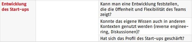 “Am Ende muss die Chemie stimmen.” Natürlich entscheidet meist dann doch “der Bauch”, sprich das Unbewusste. Deshalb empfehlen wir immer die Verwendung psychologischer Modelle, wie z.B. die limbic map, bei der Bewertung des Teams. Denn auch “die Chemie” will verstanden werden: Natürlich ist eine möglichst gute Aufteilung im Team wichtig, Durchsetzungsstärke muss sich mit Empathie, Ehrgeiz mit Flexibilität, Professionalität mit Offenheit paaren. Wir haben gute Erfahrungen mit einem gemeinsamen Wochenende gemacht, bei dem die Start-ups aufgefordert werden, die Probleme der etablierten Unternehmen zu lösen – zunächst einmal unabhängig von ihren eigenen Angeboten. Hier zeigen sich schnell wichtige Kompetenzen.